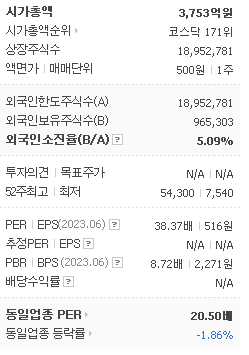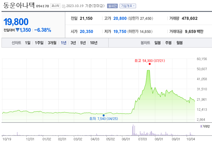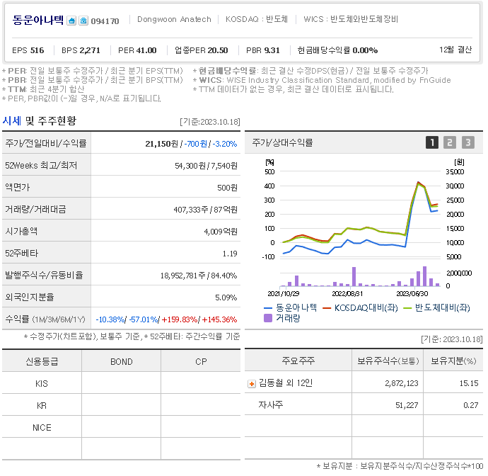 외국인 보유 비중은 407,333% 이며 장중 거래량은 18,952,781를 기록했습니다. 매출액은 414억 원, 영업이익은 -63억 원을 달성했습니다. EPS는 없음원이며 동운아나텍 주식 배당수익률은 507% 입니다.