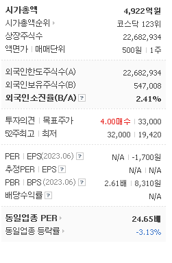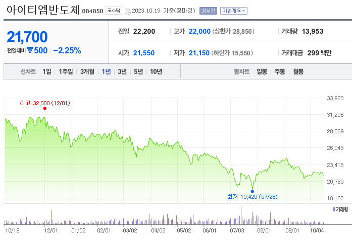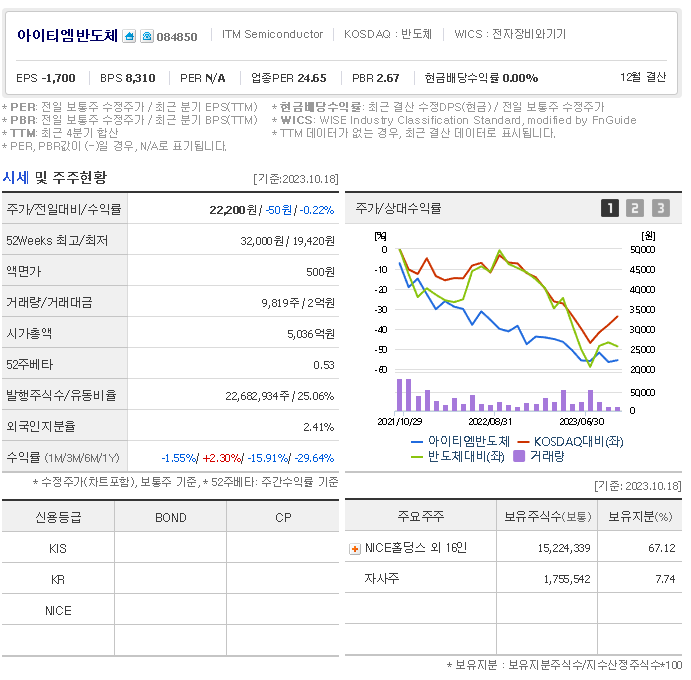 외국인 보유 비중은 9,819% 이며 장중 거래량은 22,682,934를 기록했습니다. 매출액은 2,173억 원, 영업이익은 -162억 원을 달성했습니다. EPS는 -582원이며 아이티엠반도체 주식 배당수익률은 1.06% 입니다.
