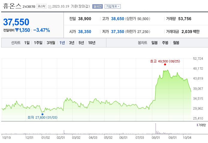 휴온스 현재 주가는 38,900원이며 전일 대비 -600원의 모습을 보이고 있습니다. 휴온스의 주주현황을 살펴보면 휴온스글로벌(외 5인)이 지분 44.81%를 소유하고 있습니다. 휴온스는 제약 기업으로 장중 기준으로 주가는 38,900원 입니다. 삼성전자의 시가 총액은 4498억 원이며 발행 주식수는 24.48주 입니다.