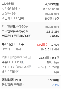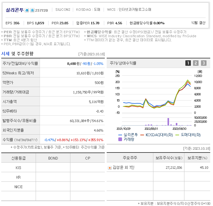 외국인 보유 비중은 1,158,748% 이며 장중 거래량은 60,331,084를 기록했습니다. 매출액은 1,362억 원, 영업이익은 142억 원을 달성했습니다. EPS는 581원이며 실리콘투 주식 배당수익률은 5,116% 입니다.