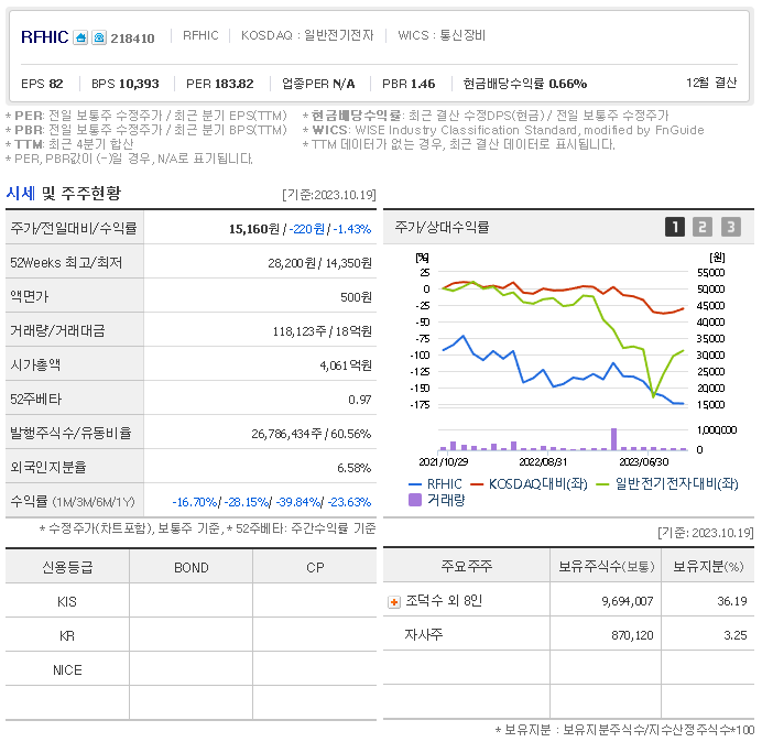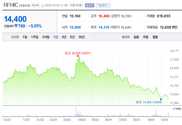 RFHIC 현재 주가는 15,160원이며 전일 대비 -220원의 모습을 보이고 있습니다. RFHIC의 주주현황을 살펴보면 조덕수(외 8인)이 지분 36.19%를 소유하고 있습니다. RFHIC는 통신장비 기업으로 장중 기준으로 주가는 15,160원 입니다. 삼성전자의 시가 총액은 4031억 원이며 발행 주식수는 6.58주 입니다.