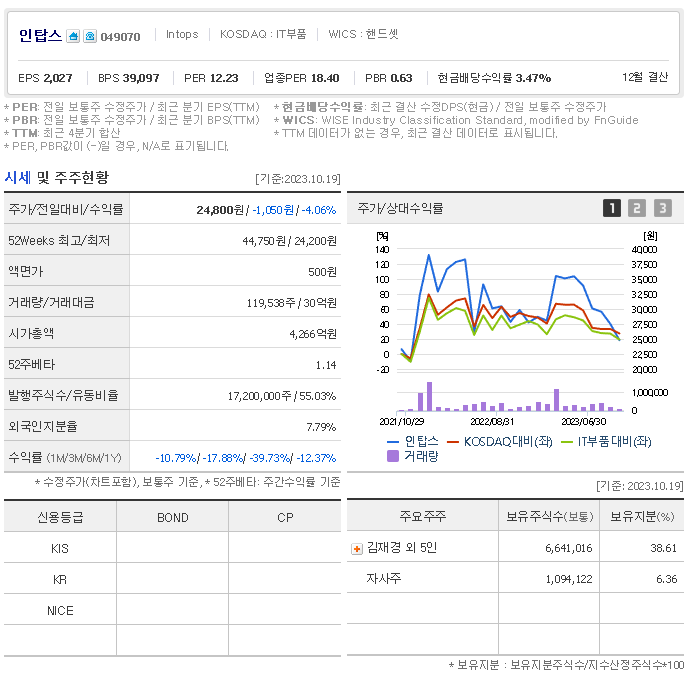 인탑스 현재 주가는 24,800원이며 전일 대비 -1,050원의 모습을 보이고 있습니다. 인탑스의 주주현황을 살펴보면 김재경(외 5인)이 지분 38.61%를 소유하고 있습니다. 인탑스는 휴대폰 및 관련부품 기업으로 장중 기준으로 주가는 24,800원 입니다. 삼성전자의 시가 총액은 4137억 원이며 발행 주식수는 7.79주 입니다.