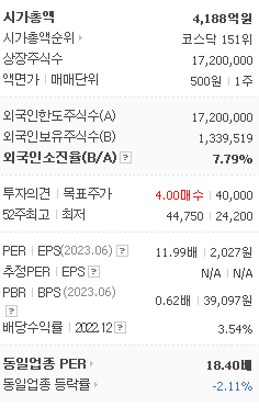 외국인 보유 비중은 119,538% 이며 장중 거래량은 17,200,000를 기록했습니다. 매출액은 3,088억 원, 영업이익은 1,420억 원을 달성했습니다. EPS는 1,907원이며 인탑스 주식 배당수익률은 1.06% 입니다.