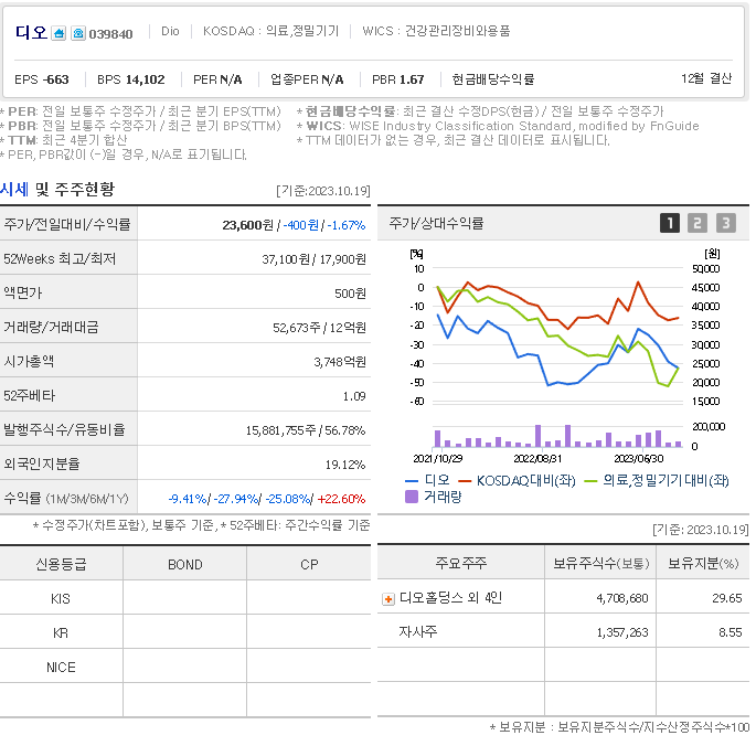디오 현재 주가는 23,600원이며 전일 대비 -400원의 모습을 보이고 있습니다. 디오의 주주현황을 살펴보면 디오홀딩스(외 4인)이 지분 29.65%를 소유하고 있습니다. 디오는 의료 장비 및 서비스 기업으로 장중 기준으로 주가는 23,600원 입니다. 삼성전자의 시가 총액은 3692억 원이며 발행 주식수는 19.12주 입니다.
