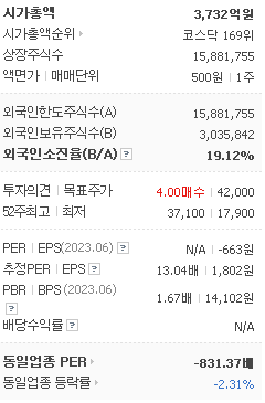 외국인 보유 비중은 52,673% 이며 장중 거래량은 15,881,755를 기록했습니다. 매출액은 851억 원, 영업이익은 -44억 원을 달성했습니다. EPS는 1,802원이며 디오 주식 배당수익률은 0.72% 입니다.