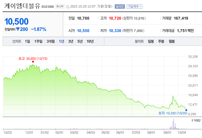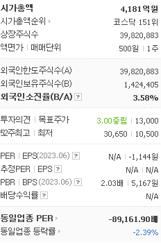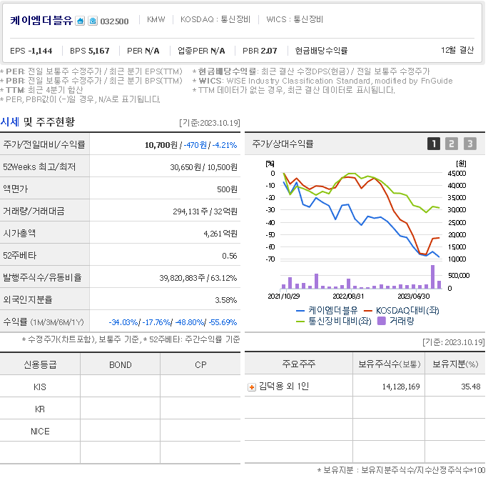 외국인 보유 비중은 294,131% 이며 장중 거래량은 39,820,883를 기록했습니다. 매출액은 561억 원, 영업이익은 -450억 원을 달성했습니다. EPS는 -1,369원이며 케이엠더블유 주식 배당수익률은 % 입니다.