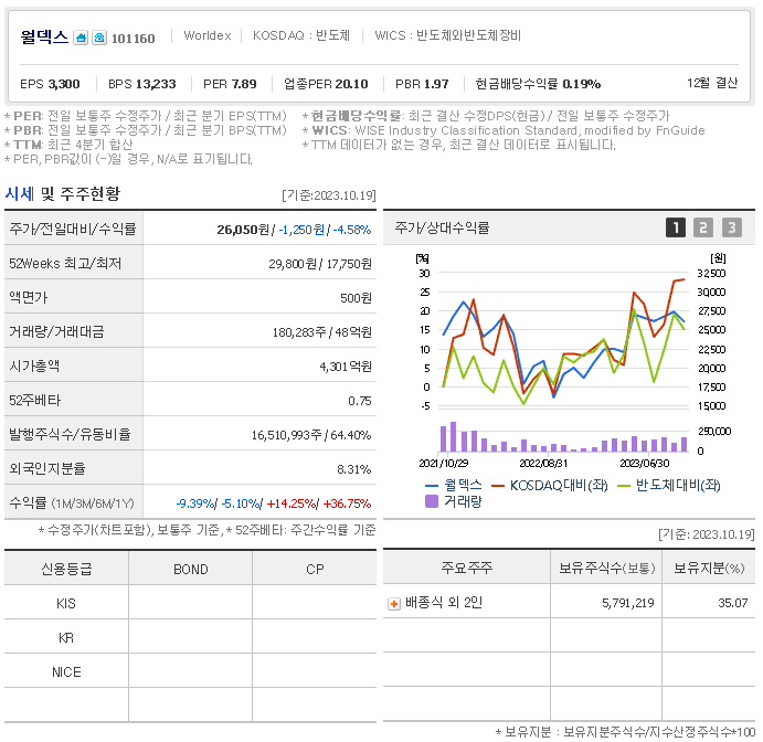 월덱스 현재 주가는 26,050원이며 전일 대비 -1,250원의 모습을 보이고 있습니다. 월덱스의 주주현황을 살펴보면 배종식(외 2인)이 지분 35.07%를 소유하고 있습니다. 월덱스는 반도체 및 관련장비 기업으로 장중 기준으로 주가는 26,050원 입니다. 삼성전자의 시가 총액은 4235억 원이며 발행 주식수는 8.31주 입니다.