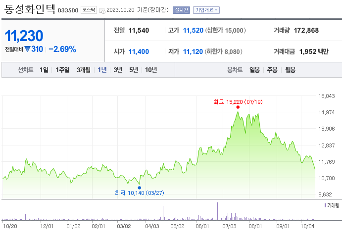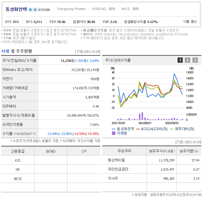 동성화인텍 현재 주가는 11,540원이며 전일 대비 -230원의 모습을 보이고 있습니다. 동성화인텍의 주주현황을 살펴보면 이 지분 37.94%를 소유하고 있습니다. 동성화인텍는 화학 기업으로 장중 기준으로 주가는 11,540원 입니다. 삼성전자의 시가 총액은 3368억 원이며 발행 주식수는 7.02주 입니다.
