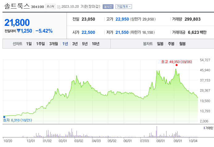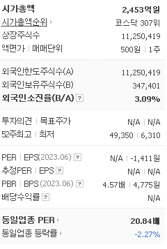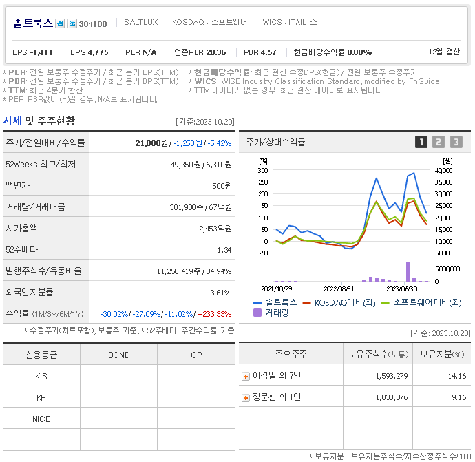외국인 보유 비중은 256,379% 이며 장중 거래량은 11,250,419를 기록했습니다. 매출액은 65억 원, 영업이익은 -20억 원을 달성했습니다. EPS는 없음원이며 솔트룩스 주식 배당수익률은 52.26% 입니다.