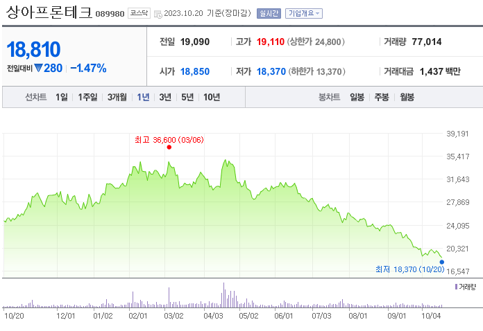 상아프론테크 현재 주가는 19,090원이며 전일 대비 -540원의 모습을 보이고 있습니다. 상아프론테크의 주주현황을 살펴보면 이상원(외 20인)이 지분 42.40%를 소유하고 있습니다. 상아프론테크는 전자 장비 및 기기 기업으로 장중 기준으로 주가는 19,090원 입니다. 삼성전자의 시가 총액은 3008억 원이며 발행 주식수는 3.21주 입니다.