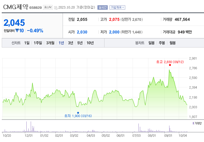 이 글에서는 CMG제약 주가 전망과 목표 주가, 기업 정보에 대해서 설명합니다. 주식 거래에서 중요한 부분은 현재 기업 가치보다는 미래의 기업 가치를 예측하고 먼저 행동하는 것입니다. 투자할 종목을 고르기 전에 현재 기업의 상황과 지표를 살펴보는 것이 중요합니다. CMG제약 주식의 주요 현황과 투자 정보를 확인하시고 주식 투자에 유용한 정보들을 한 곳에 정리해두었으니 투자 전에 확인하시기 바랍니다.