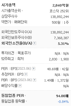 외국인 보유 비중은 469,729% 이며 장중 거래량은 138,892,244를 기록했습니다. 매출액은 484억 원, 영업이익은 30억 원을 달성했습니다. EPS는 없음원이며 CMG제약 주식 배당수익률은 -0.21% 입니다.