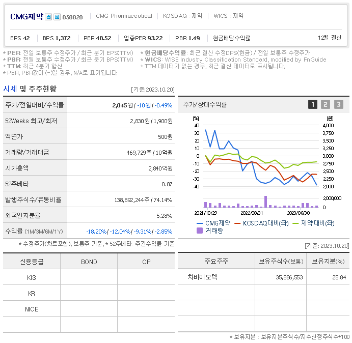 CMG제약 현재 주가는 2,045원이며 전일 대비 -10원의 모습을 보이고 있습니다. CMG제약의 주주현황을 살펴보면 이 지분 25.84%를 소유하고 있습니다. CMG제약는 제약 기업으로 장중 기준으로 주가는 2,045원 입니다. 삼성전자의 시가 총액은 2840억 원이며 발행 주식수는 5.28주 입니다.