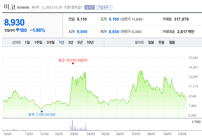 외국인 보유 비중은 318,250% 이며 장중 거래량은 33,416,778를 기록했습니다. 매출액은 1,947억 원, 영업이익은 643억 원을 달성했습니다. EPS는 없음원이며 미코 주식 배당수익률은 972% 입니다.