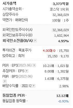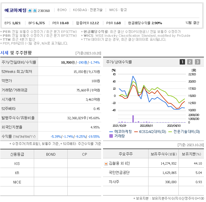 외국인 보유 비중은 75,668% 이며 장중 거래량은 32,368,029를 기록했습니다. 매출액은 1,744억 원, 영업이익은 566억 원을 달성했습니다. EPS는 1,302원이며 에코마케팅 주식 배당수익률은 2.15% 입니다.