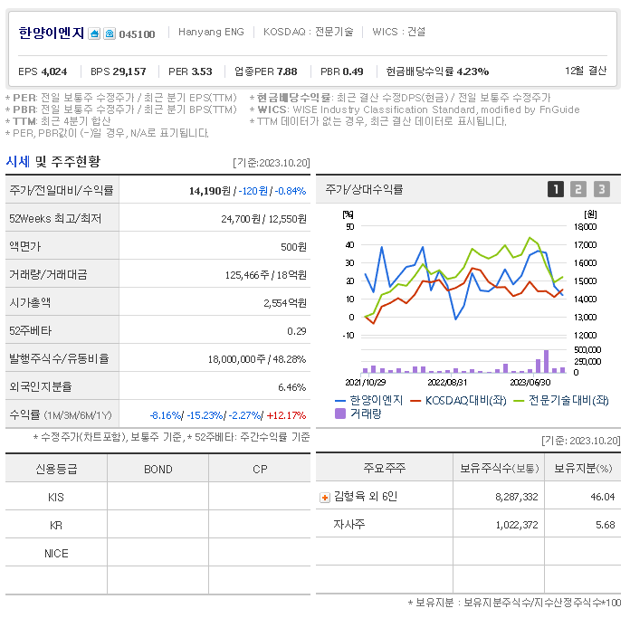 이 글에서는 한양이엔지 주가 전망과 목표 주가, 기업 정보에 대해서 설명합니다. 주식 거래에서 중요한 부분은 현재 기업 가치보다는 미래의 기업 가치를 예측하고 먼저 행동하는 것입니다. 투자할 종목을 고르기 전에 현재 기업의 상황과 지표를 살펴보는 것이 중요합니다. 한양이엔지 주식의 주요 현황과 투자 정보를 확인하시고 주식 투자에 도움을 줄 자료들을 모아 두었으니 투자 결정에 도움을 받으시길 바랍니다.