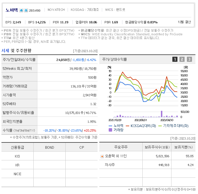 외국인 보유 비중은 136,101% 이며 장중 거래량은 10,575,831를 기록했습니다. 매출액은 452억 원, 영업이익은 265억 원을 달성했습니다. EPS는 2,458원이며 노바텍 주식 배당수익률은 52.26% 입니다.