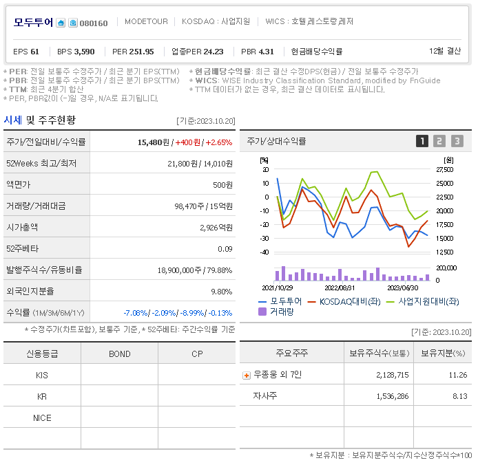 외국인 보유 비중은 98,470% 이며 장중 거래량은 18,900,000를 기록했습니다. 매출액은 813억 원, 영업이익은 -163억 원을 달성했습니다. EPS는 746원이며 모두투어 주식 배당수익률은 0.72% 입니다.