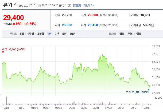 외국인 보유 비중은 8,255% 이며 장중 거래량은 10,001,865를 기록했습니다. 매출액은 1,061억 원, 영업이익은 437억 원을 달성했습니다. EPS는 1,976원이며 뷰웍스 주식 배당수익률은 0.96% 입니다.