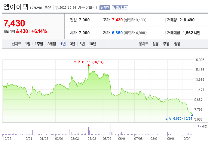 엠아이텍 현재 주가는 7,000원이며 전일 대비 -230원의 모습을 보이고 있습니다. 엠아이텍의 주주현황을 살펴보면 시너지이노베이션(외 3인)이 지분 53.48%를 소유하고 있습니다. 엠아이텍는 의료 장비 및 서비스 기업으로 장중 기준으로 주가는 7,000원 입니다. 삼성전자의 시가 총액은 2398억 원이며 발행 주식수는 5.52주 입니다.