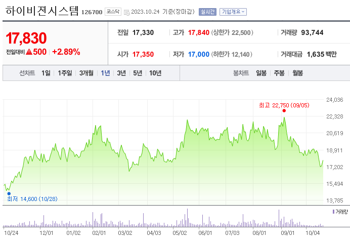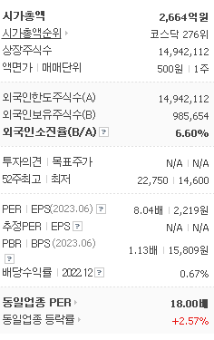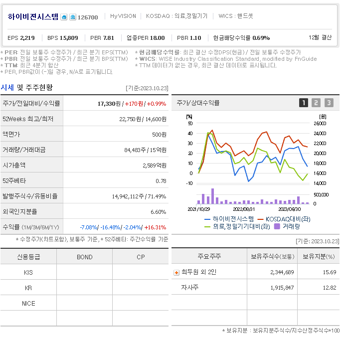외국인 보유 비중은 84,483% 이며 장중 거래량은 14,942,112를 기록했습니다. 매출액은 1,006억 원, 영업이익은 251억 원을 달성했습니다. EPS는 없음원이며 하이비젼시스템 주식 배당수익률은 0.66% 입니다.