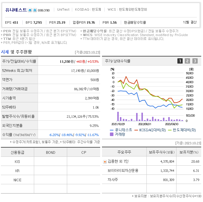 외국인 보유 비중은 86,382% 이며 장중 거래량은 21,134,126를 기록했습니다. 매출액은 1,126억 원, 영업이익은 -60억 원을 달성했습니다. EPS는 없음원이며 유니테스트 주식 배당수익률은 % 입니다.