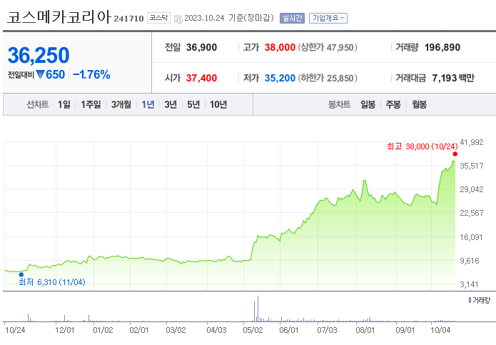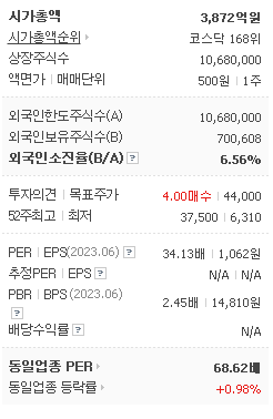 외국인 보유 비중은 276,457% 이며 장중 거래량은 10,680,000를 기록했습니다. 매출액은 2,316억 원, 영업이익은 104억 원을 달성했습니다. EPS는 1,863원이며 코스메카코리아 주식 배당수익률은 % 입니다.