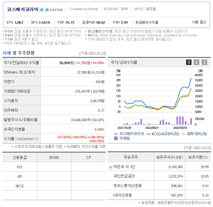 코스메카코리아 현재 주가는 36,900원이며 전일 대비 원의 모습을 보이고 있습니다. 코스메카코리아의 주주현황을 살펴보면 박은희(외 3인)이 지분 38.95%를 소유하고 있습니다. 코스메카코리아는 개인생활용품 기업으로 장중 기준으로 주가는 36,900원 입니다. 삼성전자의 시가 총액은 3872억 원이며 발행 주식수는 6.56주 입니다.