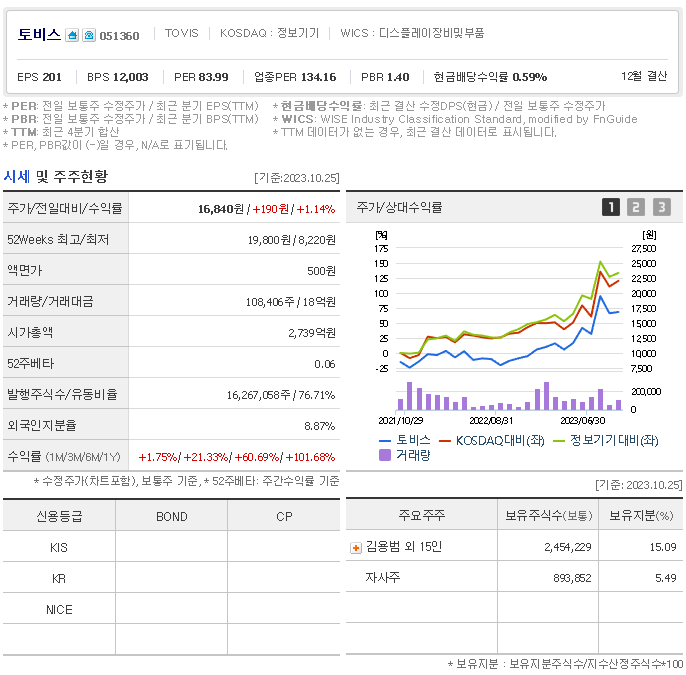 외국인 보유 비중은 108,406% 이며 장중 거래량은 16,267,058를 기록했습니다. 매출액은 1,910억 원, 영업이익은 70억 원을 달성했습니다. EPS는 1,289원이며 토비스 주식 배당수익률은 2,739% 입니다.