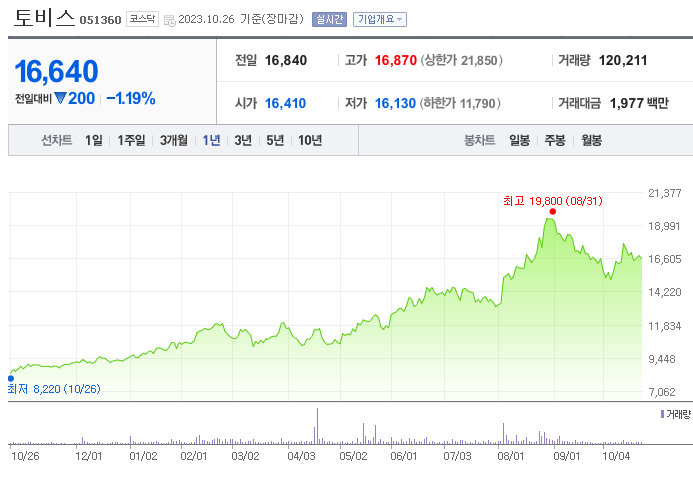 토비스 현재 주가는 16,840원이며 전일 대비 원의 모습을 보이고 있습니다. 토비스의 주주현황을 살펴보면 김용범(외 15인)이 지분 15.09%를 소유하고 있습니다. 토비스는 디스플레이 및 관련부품 기업으로 장중 기준으로 주가는 16,840원 입니다. 삼성전자의 시가 총액은 2707억 원이며 발행 주식수는 8.87주 입니다.