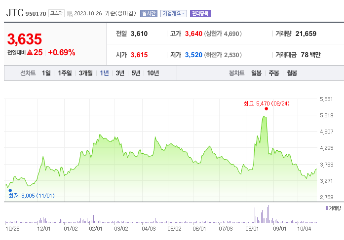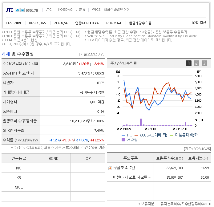 외국인 보유 비중은 41,794% 이며 장중 거래량은 50,288,623를 기록했습니다. 매출액은 267억 원, 영업이익은 -150억 원을 달성했습니다. EPS는 없음원이며 JTC 주식 배당수익률은 5% 입니다.