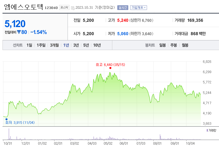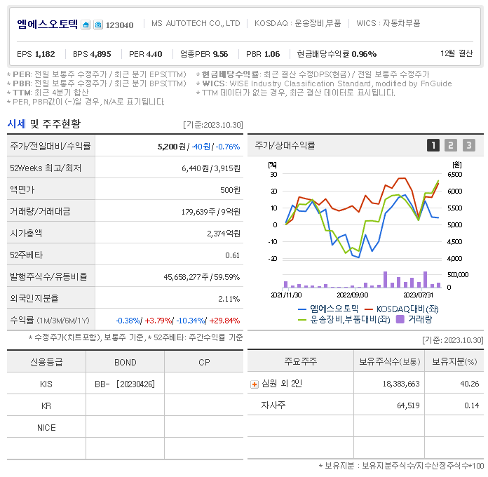 외국인 보유 비중은 179,639% 이며 장중 거래량은 45,658,277를 기록했습니다. 매출액은 11,618억 원, 영업이익은 1,491억 원을 달성했습니다. EPS는 없음원이며 엠에스오토텍 주식 배당수익률은 8.79% 입니다.