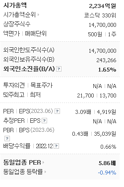 외국인 보유 비중은 3,426% 이며 장중 거래량은 14,700,000를 기록했습니다. 매출액은 1,928억 원, 영업이익은 694억 원을 달성했습니다. EPS는 없음원이며 삼목에스폼 주식 배당수익률은 % 입니다.