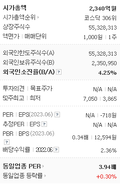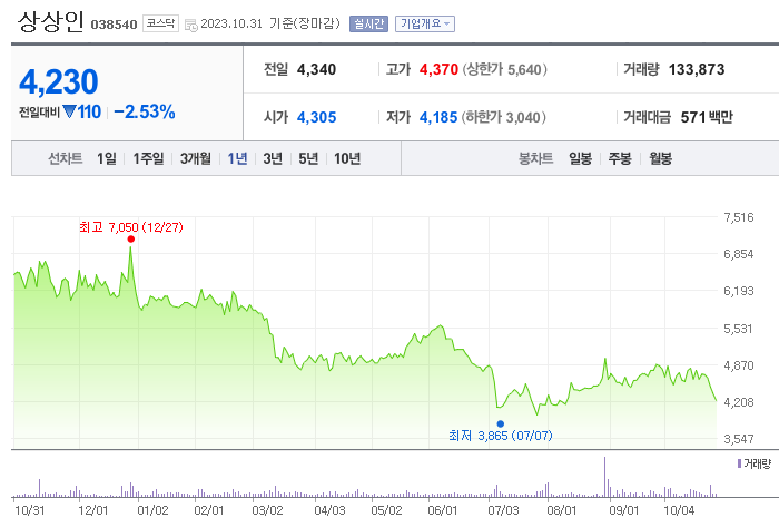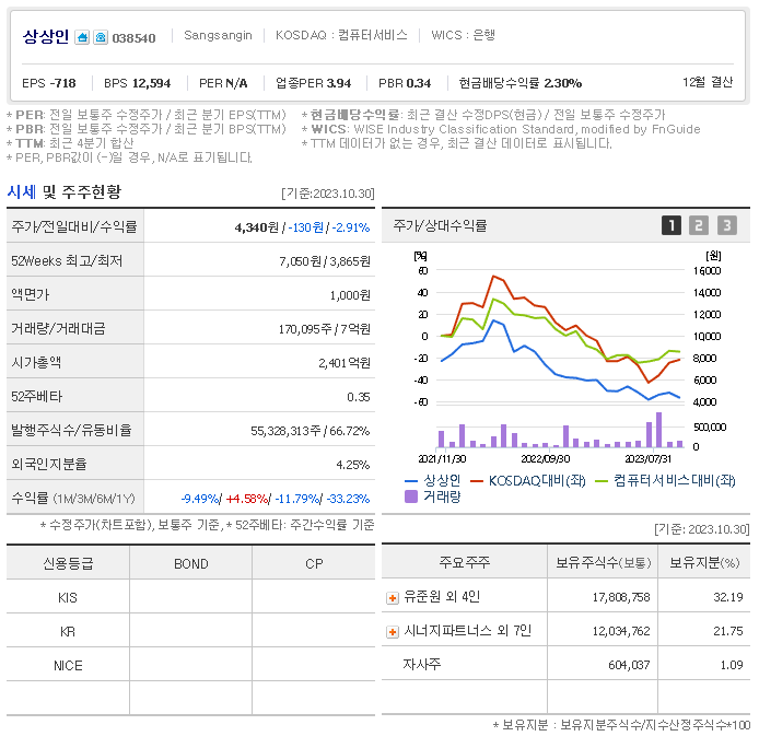 외국인 보유 비중은 170,095% 이며 장중 거래량은 55,328,313를 기록했습니다. 매출액은 4,944억 원, 영업이익은 649억 원을 달성했습니다. EPS는 없음원이며 상상인 주식 배당수익률은 2,401% 입니다.
