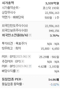 외국인 보유 비중은 63,215% 이며 장중 거래량은 22,556,163를 기록했습니다. 매출액은 256억 원, 영업이익은 121억 원을 달성했습니다. EPS는 없음원이며 비즈니스온 주식 배당수익률은 151% 입니다.