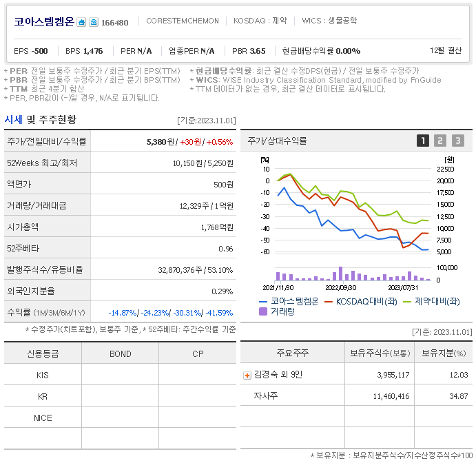 외국인 보유 비중은 12,329% 이며 장중 거래량은 32,870,376를 기록했습니다. 매출액은 221억 원, 영업이익은 -60억 원을 달성했습니다. EPS는 없음원이며 코아스템켐온 주식 배당수익률은 0.76% 입니다.