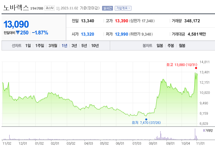 이 글에서는 노바렉스 주가 전망과 목표 주가, 기업 정보에 대해서 설명합니다. 주식 시장에서 중요한 것은 미래의 기업 가치를 예측하고 선제적으로 움직이는 것입니다. 투자할 종목을 고르기 전에 현재 기업의 현황과 데이터를 확인하는 것이 필요합니다. 노바렉스 주식의 주요 현황과 투자 정보를 확인하시고 주식 투자에 도움이 되는 정보들을 모아 제공하니 투자에 도움을 받으실 수 있을 것입니다.
