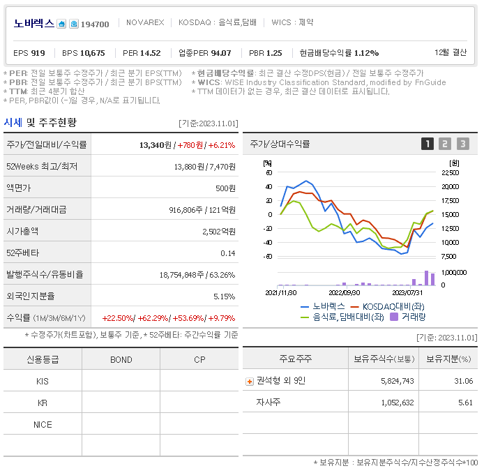 외국인 보유 비중은 916,806% 이며 장중 거래량은 18,754,848를 기록했습니다. 매출액은 1,453억 원, 영업이익은 252억 원을 달성했습니다. EPS는 1,162원이며 노바렉스 주식 배당수익률은 254% 입니다.