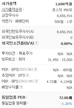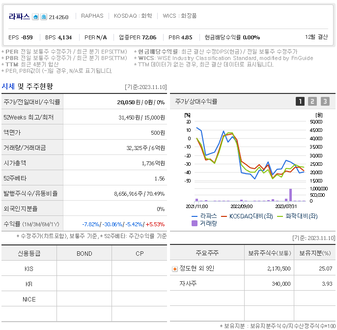 외국인 보유 비중은 32,325% 이며 장중 거래량은 8,656,916를 기록했습니다. 매출액은 140억 원, 영업이익은 -66억 원을 달성했습니다. EPS는 없음원이며 라파스 주식 배당수익률은 % 입니다.