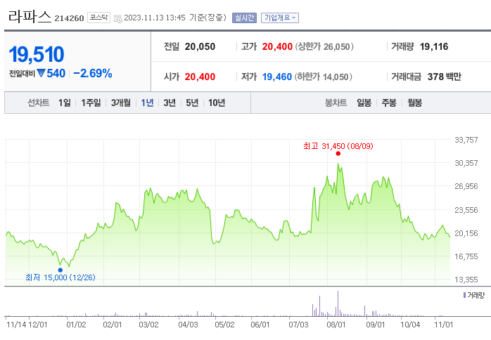라파스는 개인생활용품 기업입니다. 대표자는 정도현 이며 설립일은 2006/03/30, 주식 상장일은 2019/11/11입니다. 전체 종업원 수는106명 이고 본사 주소는 서울특별시 강서구 마곡중앙8로1길 62입니다.