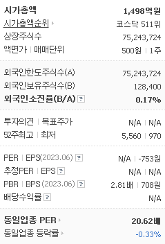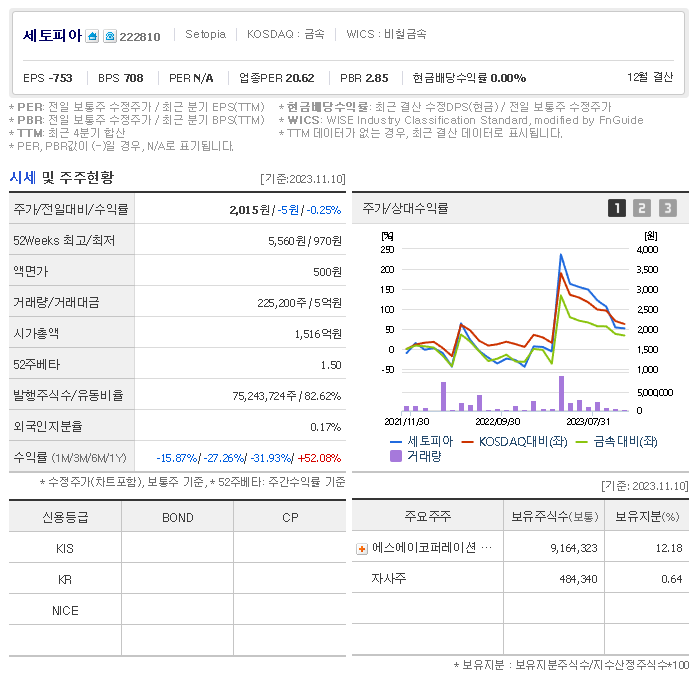 외국인 보유 비중은 225,200% 이며 장중 거래량은 75,243,724를 기록했습니다. 매출액은 596억 원, 영업이익은 -118억 원을 달성했습니다. EPS는 없음원이며 세토피아 주식 배당수익률은 % 입니다.