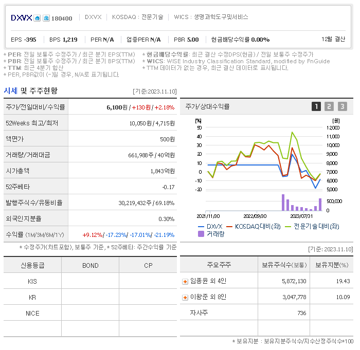 외국인 보유 비중은 661,988% 이며 장중 거래량은 30,219,432를 기록했습니다. 매출액은 235억 원, 영업이익은 26억 원을 달성했습니다. EPS는 없음원이며 DXVX 주식 배당수익률은 1.00% 입니다.
