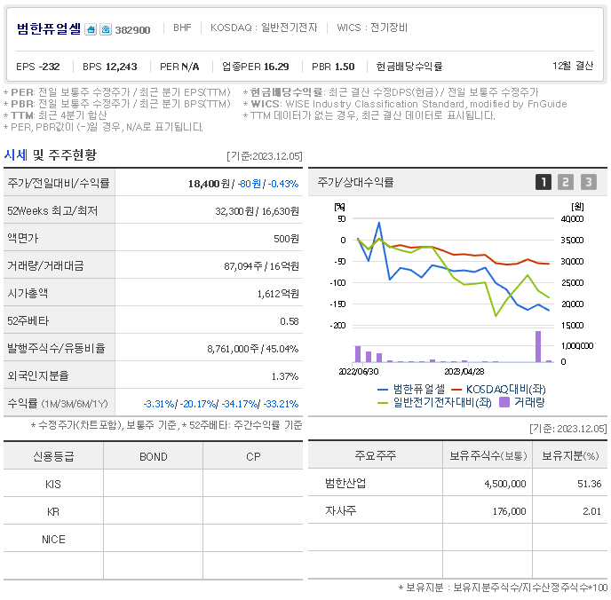 외국인 보유 비중은 87,094% 이며 장중 거래량은 8,761,000를 기록했습니다. 매출액은 231억 원, 영업이익은 13억 원을 달성했습니다. EPS는 -228원이며 범한퓨얼셀 주식 배당수익률은 13% 입니다.