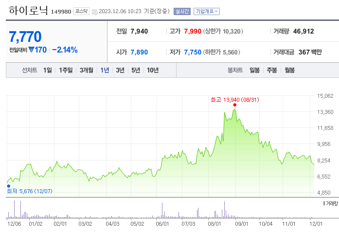 외국인 보유 비중은 134,432% 이며 장중 거래량은 15,339,233를 기록했습니다. 매출액은 230억 원, 영업이익은 36억 원을 달성했습니다. EPS는 359원이며 하이로닉 주식 배당수익률은 888,432% 입니다.