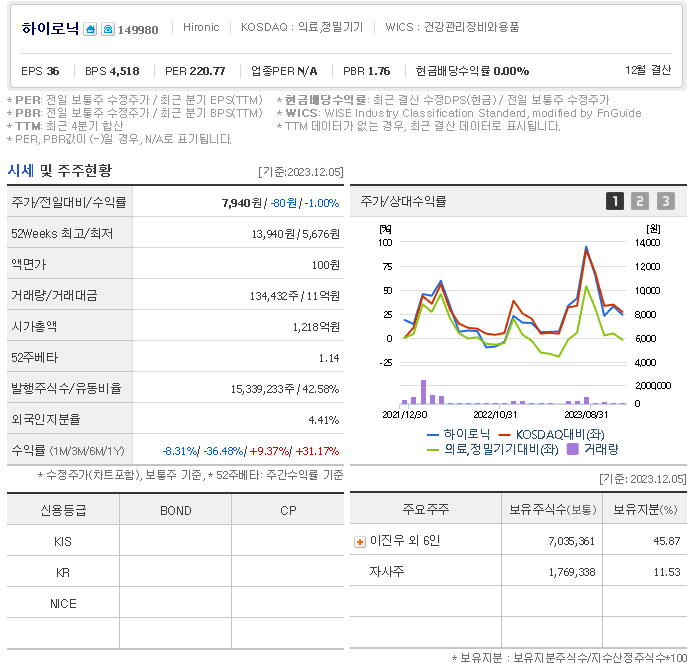 하이로닉 현재 주가는 7,940원이며 전일 대비 -80원의 모습을 보이고 있습니다. 하이로닉의 주주현황을 살펴보면 이진우(외 6인)이 지분 45.87%를 소유하고 있습니다. 하이로닉는 의료 장비 및 서비스 기업으로 장중 기준으로 주가는 7,940원 입니다. 삼성전자의 시가 총액은 1190억 원이며 발행 주식수는 4.41주 입니다.