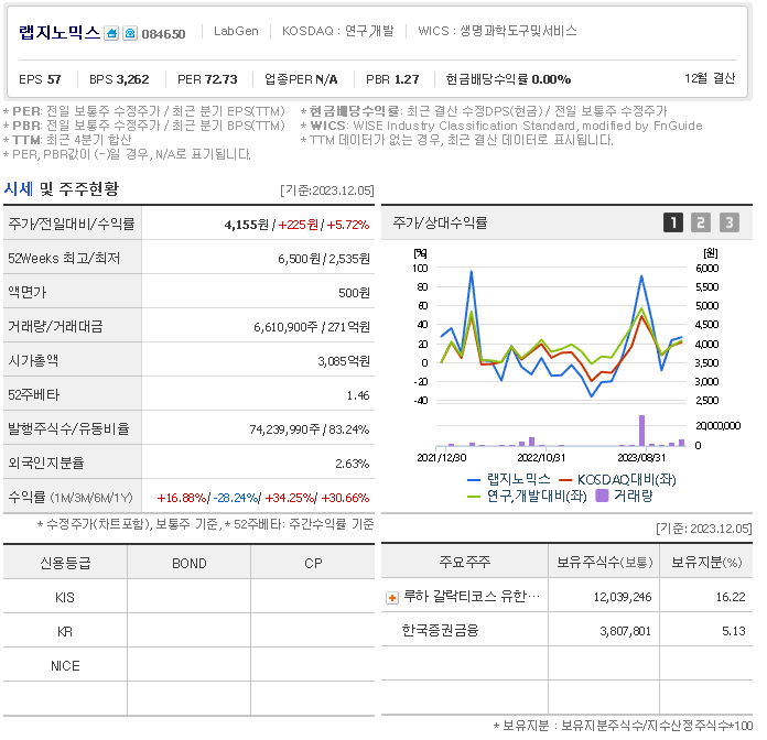 외국인 보유 비중은 6,610,900% 이며 장중 거래량은 74,239,990를 기록했습니다. 매출액은 511억 원, 영업이익은 662억 원을 달성했습니다. EPS는 115원이며 랩지노믹스 주식 배당수익률은 3.31% 입니다.