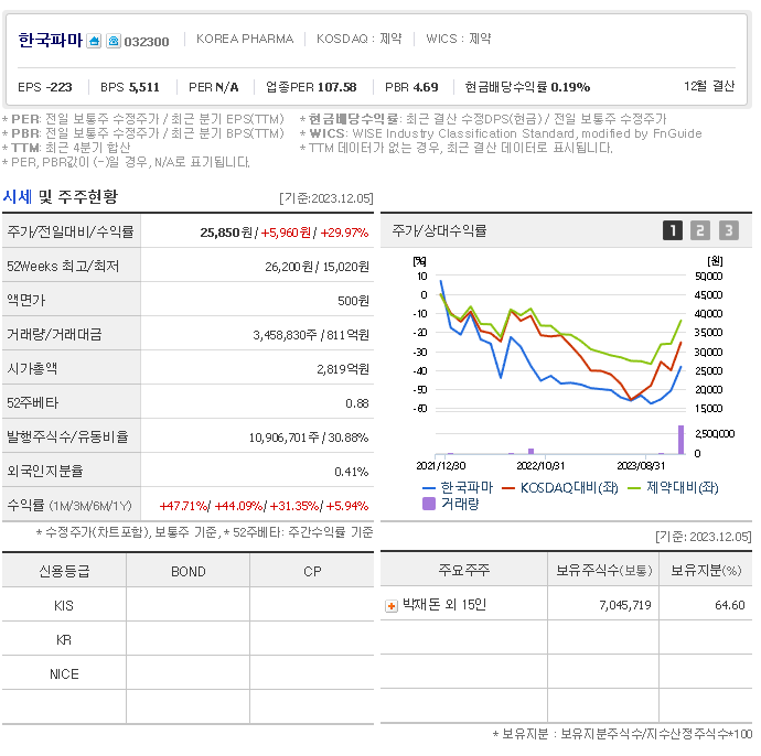 외국인 보유 비중은 3,458,831% 이며 장중 거래량은 10,906,701를 기록했습니다. 매출액은 628억 원, 영업이익은 62억 원을 달성했습니다. EPS는 없음원이며 한국파마 주식 배당수익률은 % 입니다.