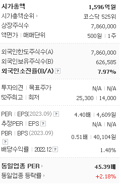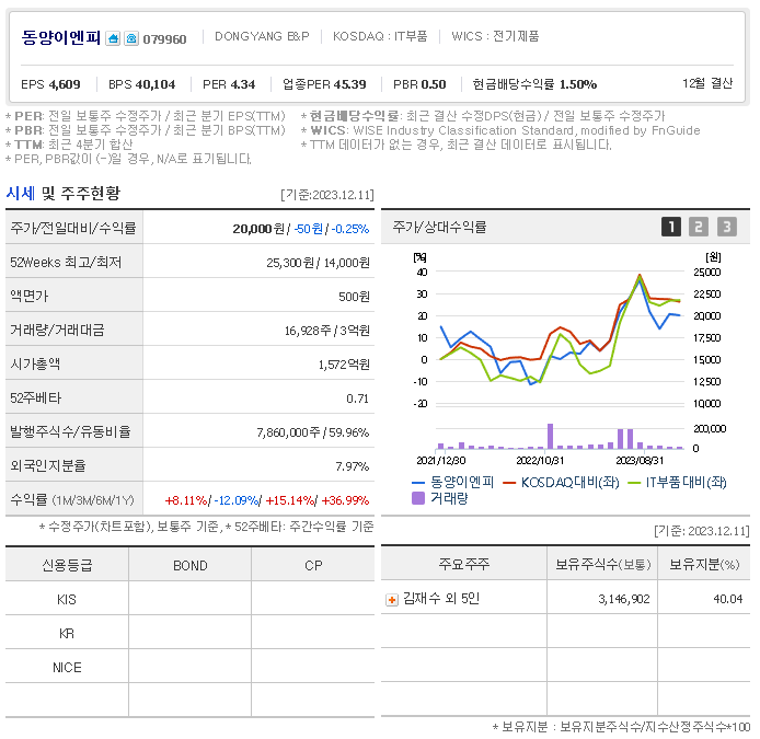 외국인 보유 비중은 16,928% 이며 장중 거래량은 7,860,000를 기록했습니다. 매출액은 4,110억 원, 영업이익은 278억 원을 달성했습니다. EPS는 없음원이며 동양이엔피 주식 배당수익률은 148% 입니다.
