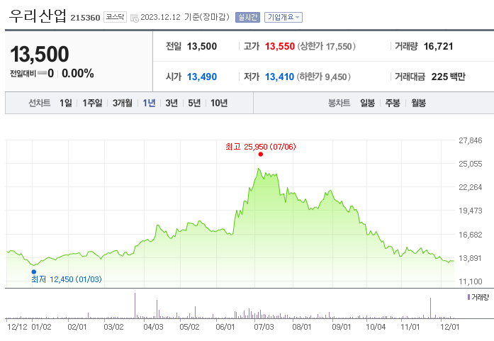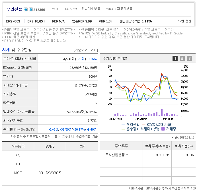 우리산업 현재 주가는 13,500원이며 전일 대비 -20원의 모습을 보이고 있습니다. 우리산업의 주주현황을 살펴보면 이 지분 39.46%를 소유하고 있습니다. 우리산업는 자동차부품 기업으로 장중 기준으로 주가는 13,500원 입니다. 삼성전자의 시가 총액은 1233억 원이며 발행 주식수는 3.77주 입니다.