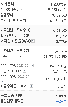 외국인 보유 비중은 11,879% 이며 장중 거래량은 9,132,163를 기록했습니다. 매출액은 3,344억 원, 영업이익은 -247억 원을 달성했습니다. EPS는 없음원이며 우리산업 주식 배당수익률은 1.13% 입니다.